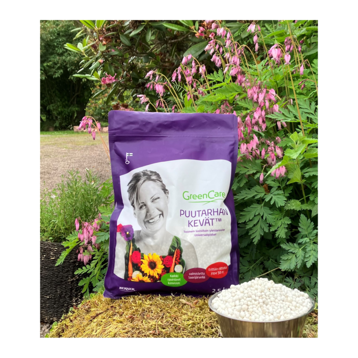 Luonnonmukaisissa puutarhoissa Maatilan Aito Kananvoima tai Puutarhan Kevät Luomu voimistavat kevätkehitystä. Sekoita luonnonrakeet aina pintamultaan, niin teho alkaa nopeammin. - Alue katetaan. Kate estää rikkakasveja ja pitää kosteutta.