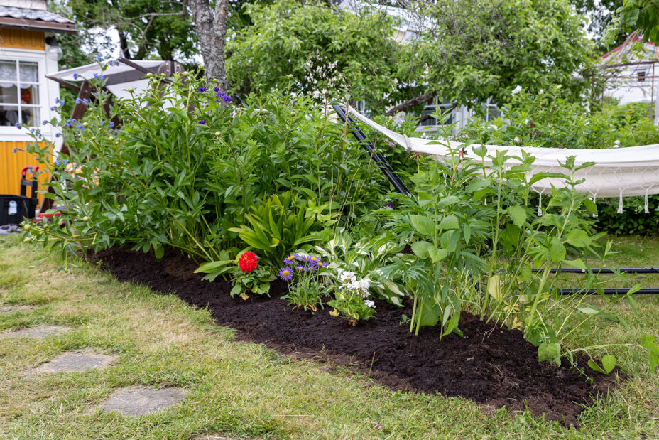 Vinkki! Kun teet omaan pihaasi vastaavaa helppohoitoista aluetta, kaiva ensin maa noin 10 cm syvyyteen. Levitä rikkakasvihuopa niin, että se ulottuu riittävän pitkälle reunoille. Leikkaa huopaan ristikkäinen aukko, jos haluat istuttaa alueelle pensaita tai muita kasveja. Kuorikate päälle ja alue on valmis!