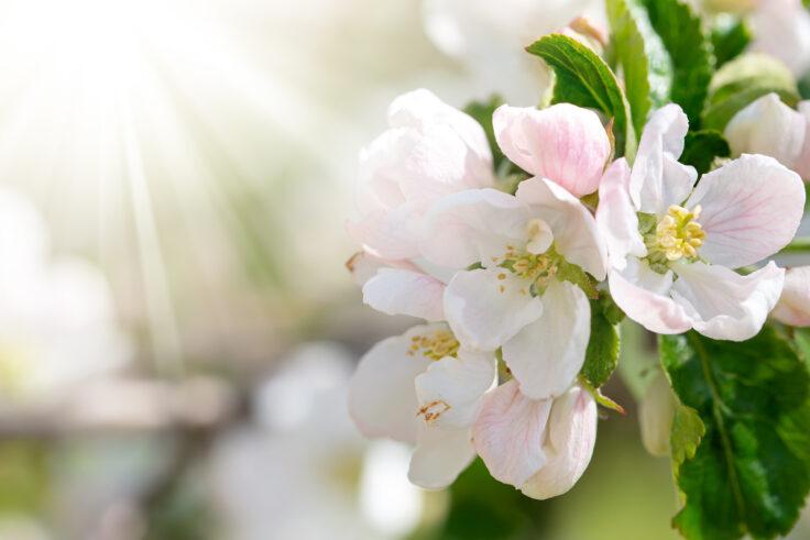 Branch with apple flowers in spring garden on natural background. Closeup
