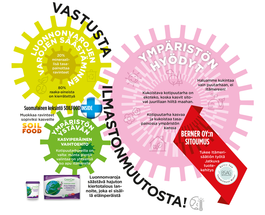 Ympäristön Ystävä -kiertotalouslannoitteessa on vain 20 % uusia mineraaleja. Ne tarvitaan tasapainottamaan ja viimeistelemään tuotteen mineraalisisältö kotipuutarhan kasveille optimaaliseksi. Hyötykäyttöön kierrätetyt ravinteet eivät päädy Itämerta rehevöittämään. Toinen merkittävä asia on, että maaperän rakennetta hoitamalla voi vaikuttaa kasvuolosuhteisiin,ravinnepäästöihin ja jopa ilmastonmuutoksen hillintään, kun hiilidioksidia saadaan varastoitua takaisin maaperään.