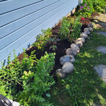 Puutarhan yleisilmettä kohennettiin luonnonkivireunuksin ja puunkuorikatteella, joka sitoo kosteutta ja ehkäisee rikkaruohoja. Katealueet rajattiin siististi, ja kävelyalueille tehtiin selkeät kulkulinjat, jotka helpottavat puutarhan hoitoa ja liikkumista.