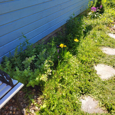 Yllä olevassa kuvassa näkyy, kuinka Niihaman siirtolapuutarhassa kohennettiin kukkapenkki lisäämällä GreenCaren kahvimultaa ja rajaamalla se luonnonkivillä. Penkkiä raivattiin hieman, jotta kukat saavat kasvutilaa. Kuvassa on sama kukkapenkki ennen ja oikealla parannuksen jälkeen. Muutos on luonteva ja sopii hyvin pihan kodikkaaseen ja viimeisteltyyn tunnelmaan.