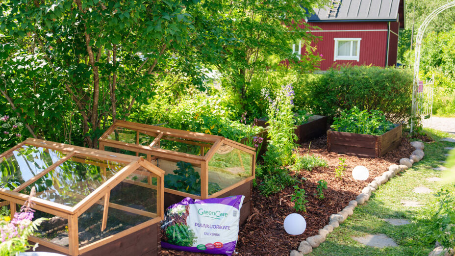 siirtolapuutarha, lavakaulusviljely, pienoiskasvihuone, kesäkurpitsa, salaatti, puutarhamulta, puunkuorikate, luonnonkivireunus, villiviini, syysleimu, aurinkokennovalot, GreenCare, puutarhurin vinkit