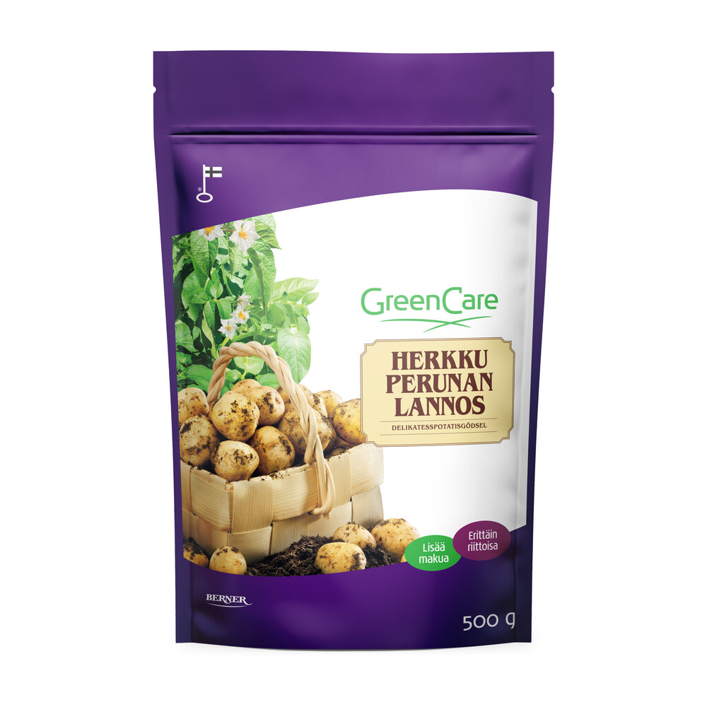 GreenCare Herkkuperunalannos on ammattilaisten suosima rakeinen lannoite, joka on helppo levittää tasaisesti. Se lisää satoa ja tekee perunoista maukkaita. Uusi 500 g pakkaus riittää jopa 8 m² perunapenkille.
