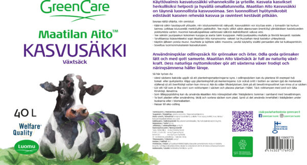 GreenCare Maatilan Aito Kasvusäkki on istutusvalmis ja luomukompostilla lannoitettu kasvusäkki vihanneksille ja yrteille. Helppo tapa kasvattaa lähiruokaa kotimaisessa, luonnonmukaisessa kasvualustassa.