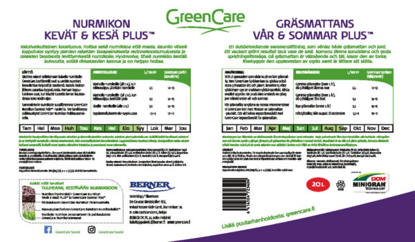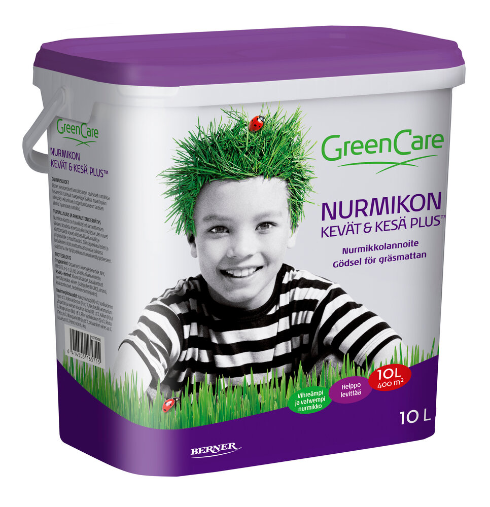 GreenCare Nurmikon KEVÄT & KESÄ PLUS™ on luonnollinen ja riittoisa nurmikkolannoite. Tekee nurmikosta vihreämmän, vahvistaa kasvualustaa ja auttaa torjumaan sammalta. Sopii myös robottileikkureilla hoidettaville nurmikoille.