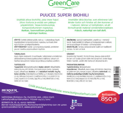 GreenCare PuuCee Superi Biohiili on männyntuoksuinen kuivakäymälän pelastaja. Nopeuttaa jätteen kompostoitumista ja poistaa hajut tehokkaasti. Sopii kaikkiin kuivakäymälöihin ympäri vuoden.