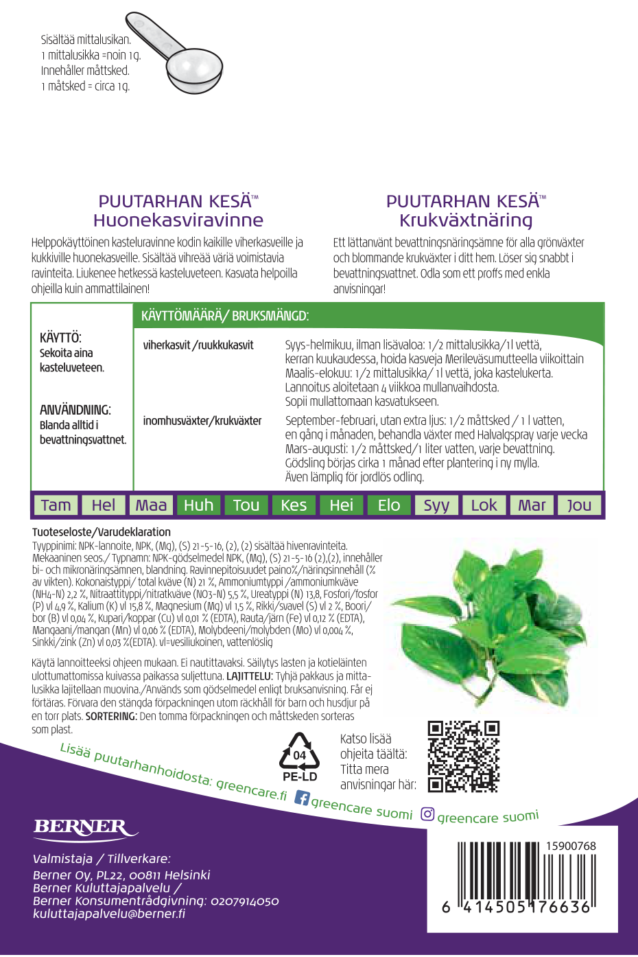 Sisältää kaikkia sisäkasvien tarvitsemia ravinteita ja lisäksi vihreää väriä voimistavia ravinteita. Puutarhan Kesä liukenee muutamalla pyöräytyksellä hetkessä kasteluveteen.