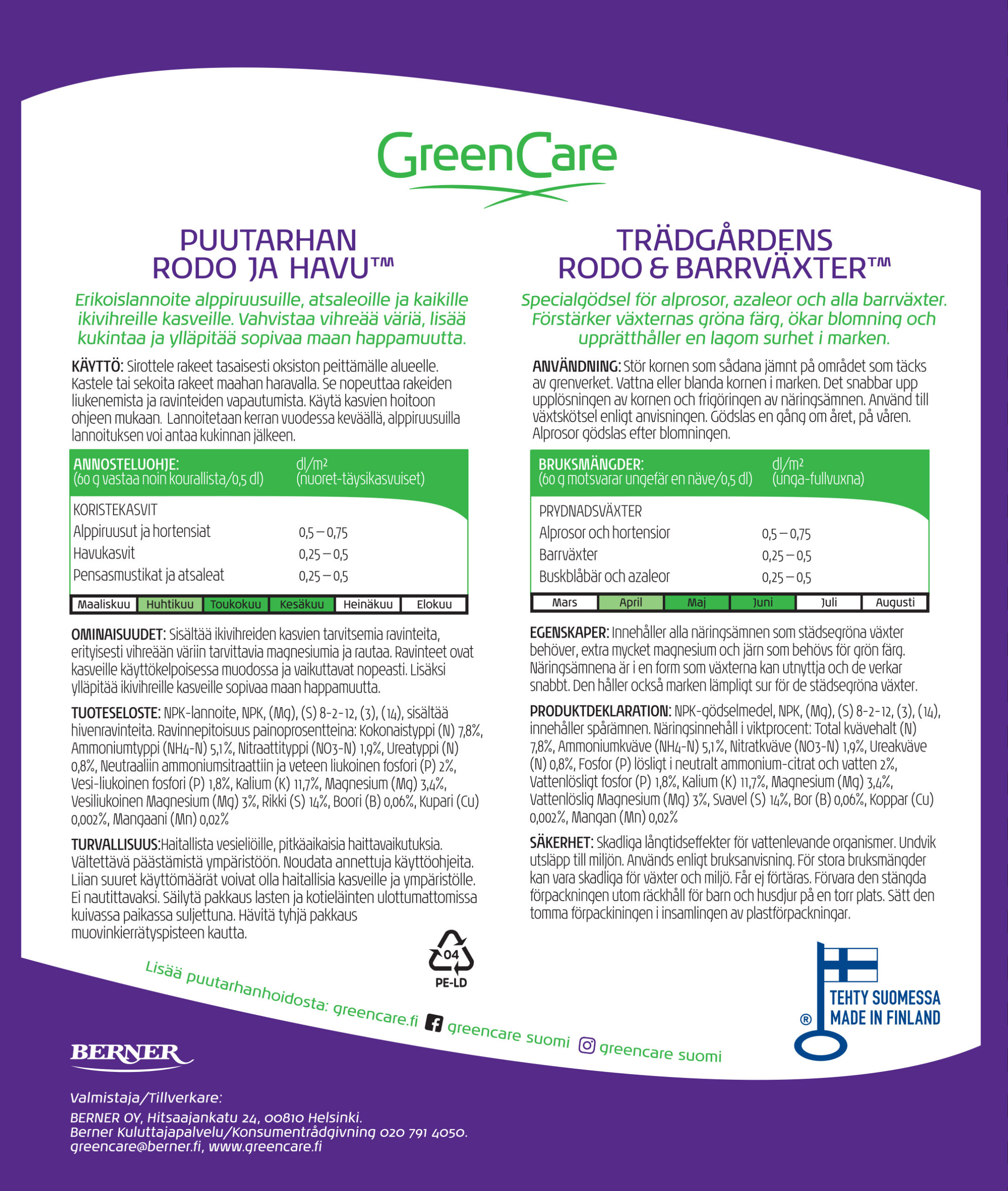 Vahvistaa vihreää väriä ja auttaa kasveja voimaan hyvin Suomen vaihtelevissa oloissa. Ylläpitää vihreille kasveille sopivaa maan happamuutta. Erittäin riittoisa.