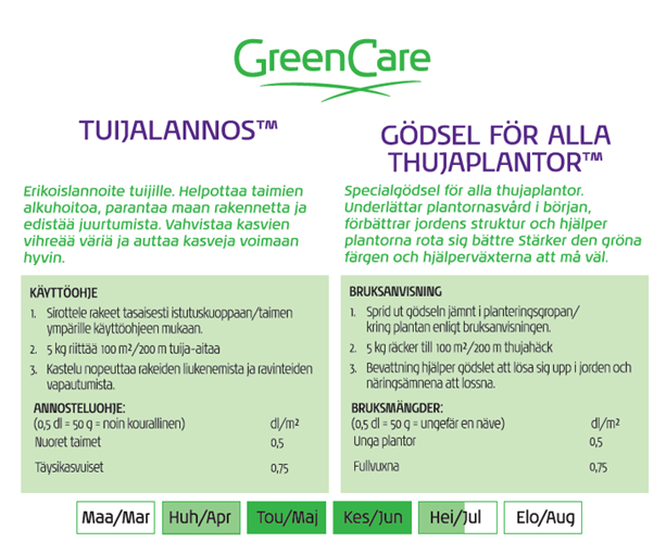 GreenCare Tuijalannos on erikoislannoite kaikille tuijille. Se edistää juurtumista, vahvistaa vihreää väriä ja tukee tuija-aitojen ja yksittäisten taimien hyvinvointia.