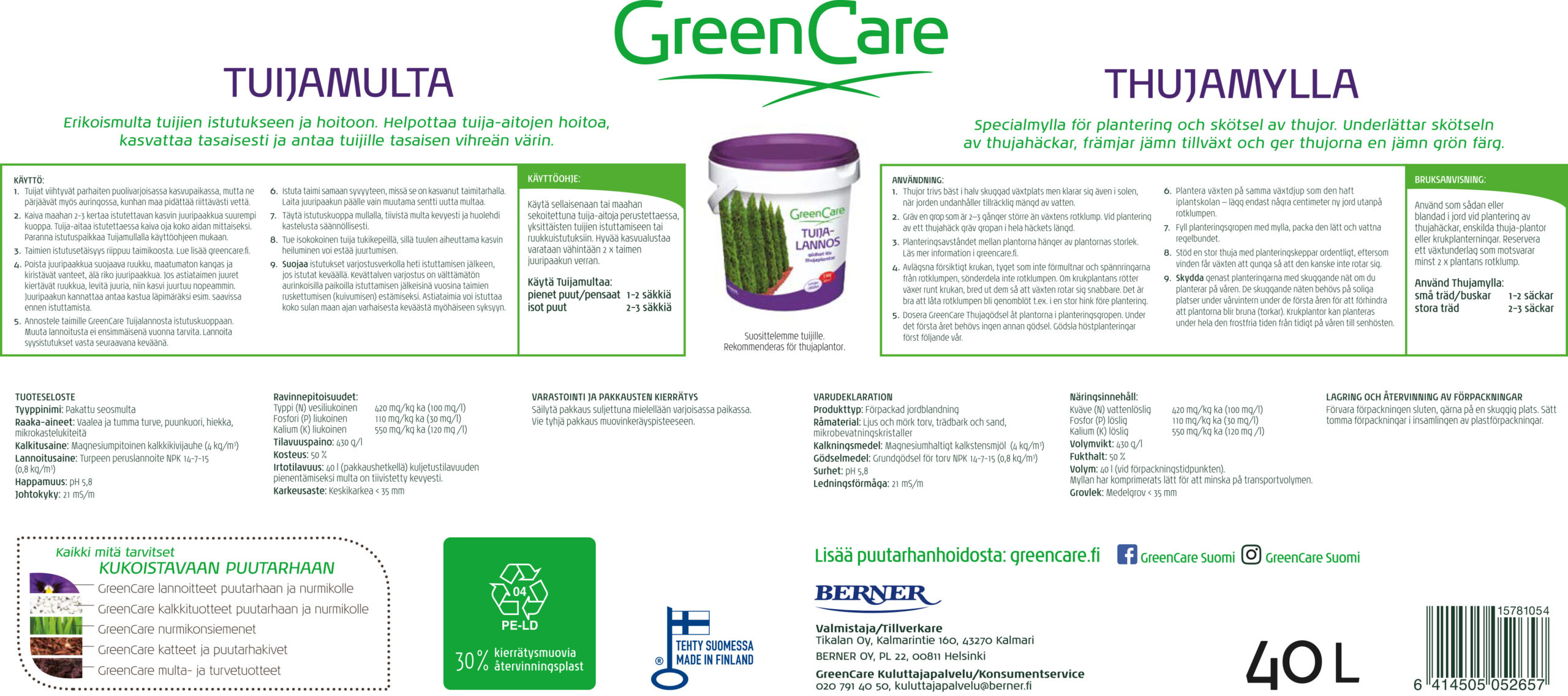 GreenCare Tuijamulta on erikoismulta tuijille. Helpottaa tuija-aitojen hoitoa, vahvistaa kasvua ja antaa tuijille tasaisen vihreän värin. Sopii myös ruukkuistutuksiin.