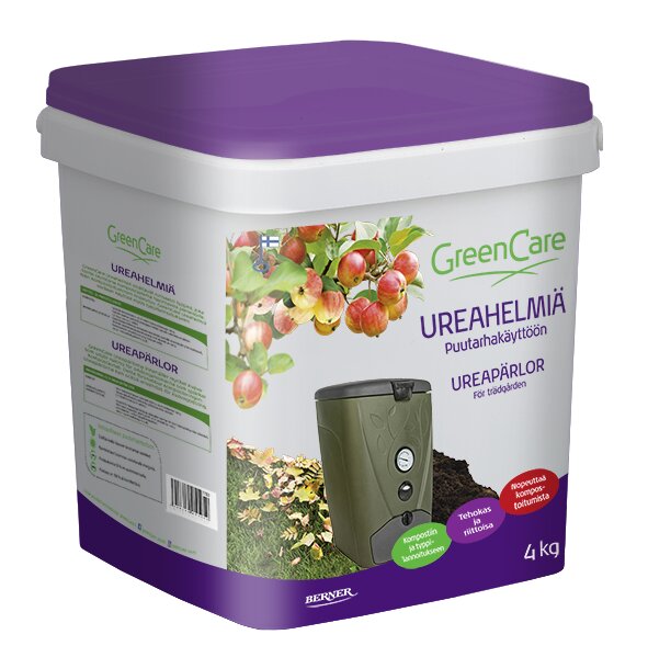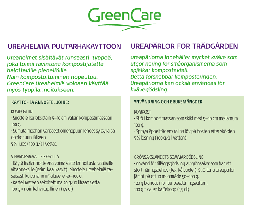 GreenCare Ureahelmiä - puutarhakäyttöön on tehokas pieneliötoiminnan herättäjä, erityisesti ravinneköyhiä oksia ja syksyn lehtiä sisältävään puutarhakompostiin tai kompostin herättelyyn talven jäljiltä.